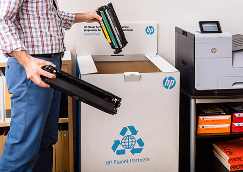 目前,超过8.75亿惠普原装墨盒与硒鼓通过惠普地球伙伴计划从客户处得到回收。超过85%的惠普原装墨盒含有4%–75%的消费后再生塑料成分。